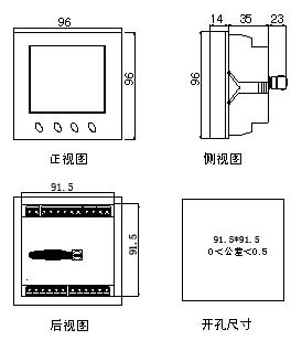外形尺寸:96mm×96mm×72mm 開(kāi)孔尺寸:91.5mm×91.5mm 安裝深度:≥58mm